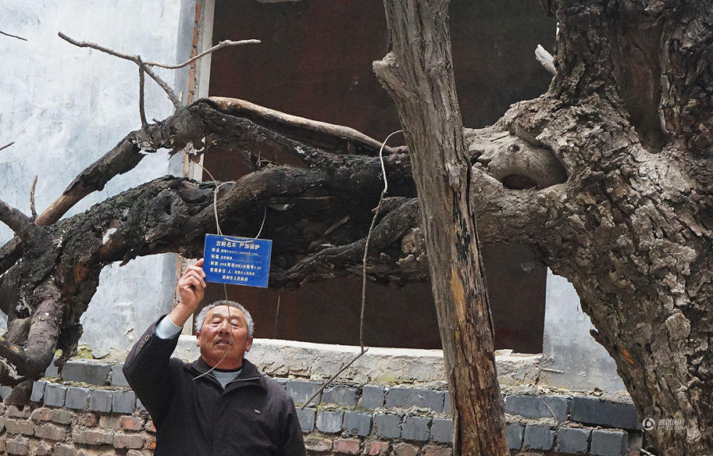 透过防护网隐约可见里面一东一西“住”着两棵沧桑古槐,由于年代久远,上面的许多虬枝已经腐烂,根部又有胳膊粗的新枝长出。古树下是一块本村王氏族人竖的石碑,上面记载,王氏族人于明末清初最先来到这里定居,然后繁衍生息,造就了今日的王村王氏家族。