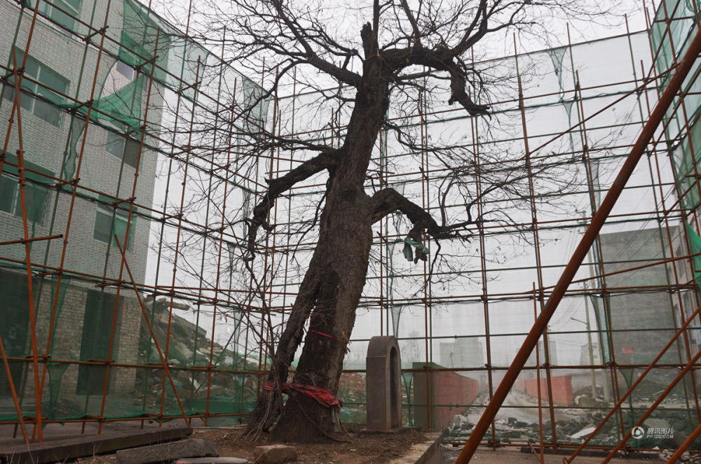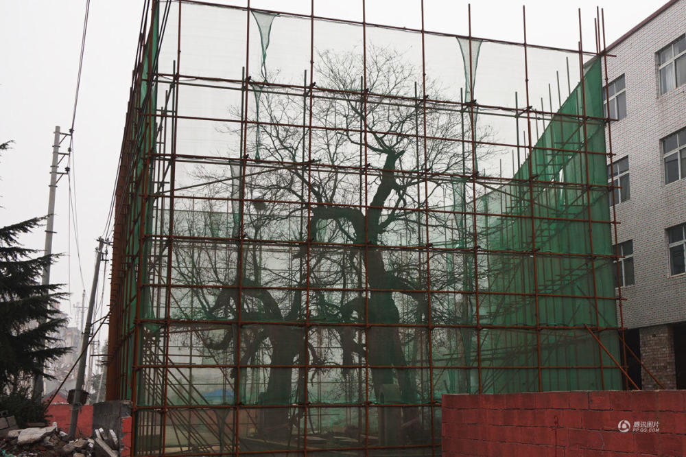 2017年1月10日,郑州市啟福大道与西三环附近一处拆迁中的城中村大街上,两个树龄300年的古槐树被人用钢管和防尘网搭建起一个巨大的“防护罩” 保护起来。视觉中国