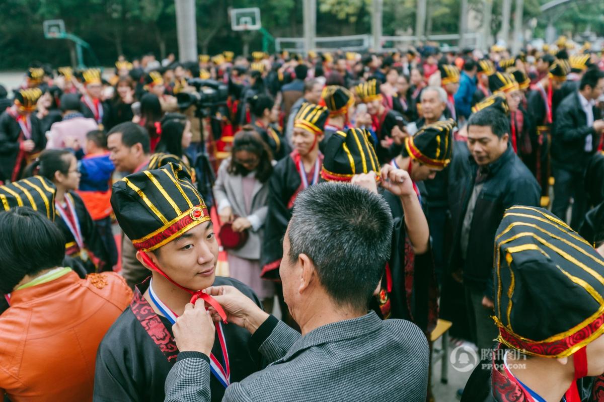 2017年1月12日,广东省惠州市一中学286名高三学生身着汉服,仿照古代习俗举行了成人礼,以这一传统仪式宣告自己成年。穿汉服、加冠笄礼、拜父母、谢师恩……我国古代两千多年前的景象完美复刻。周楠/视觉中国