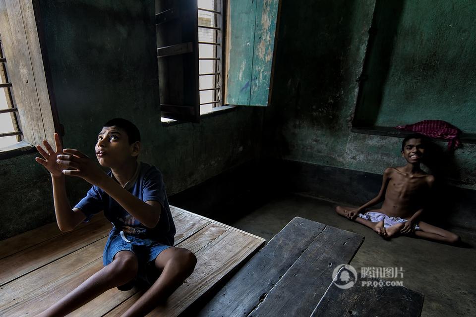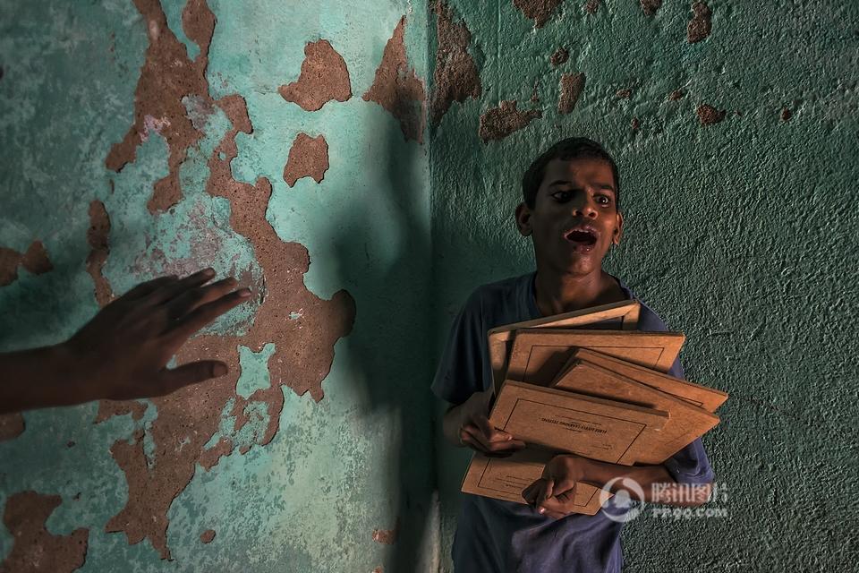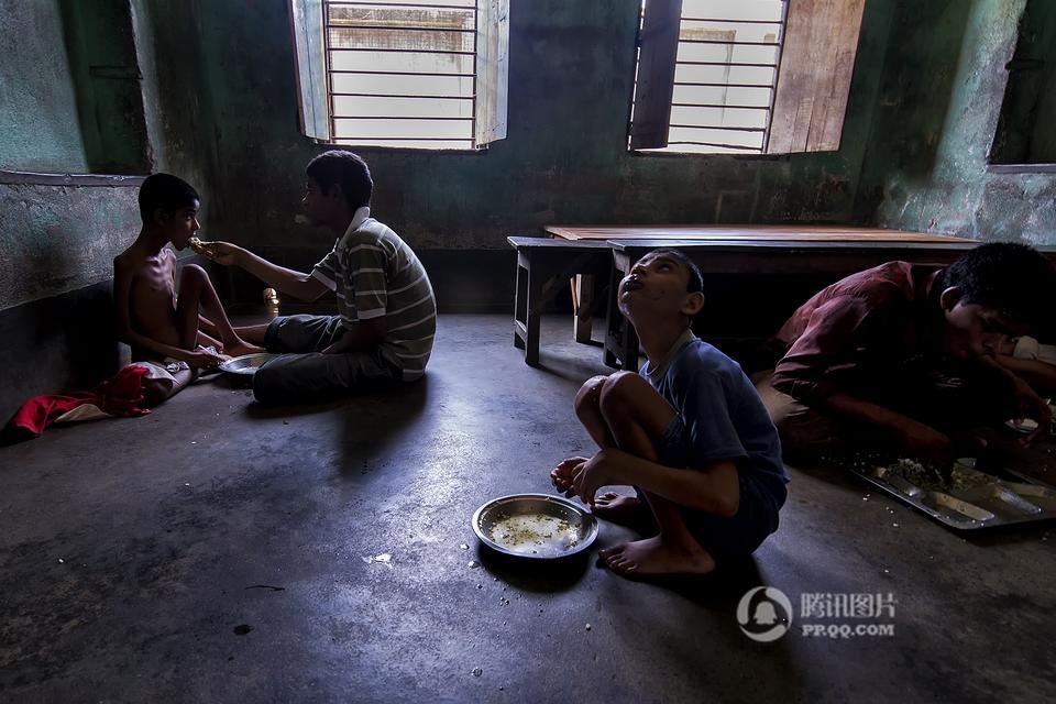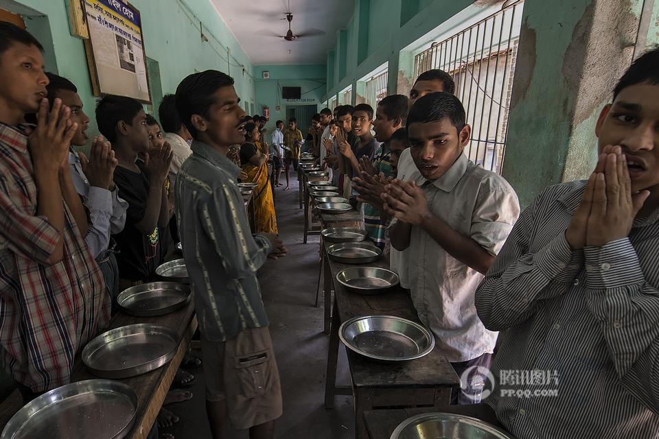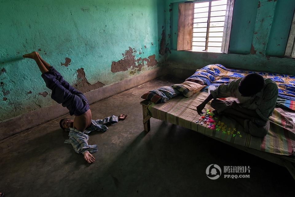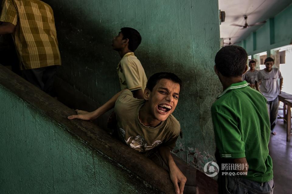 在印度西孟加拉邦哈儿迪亚镇的甘地阿什拉姆,有一所精神病院,里面生活着一群因为精神疾病而被遗弃的孩子。摄影师Joydeep Mukherjee去拜访了这个地方,并且在那里进行了三天的拍摄。通过这些照片我们很惊讶的发现,这群被灰色所笼罩的孩子们,依旧在用自己多彩的生活向他们的命运抗争着。图为精神病院内,一个孩子站在至尊拉玛克里斯纳——一个受人尊敬的印度教圣徒和传道人的照片下做祷告。本组图片拍摄于2015年5月。摄影师:Joydeep Mukherjee(个人网站 http://www.joydeepmukherjee.com/)