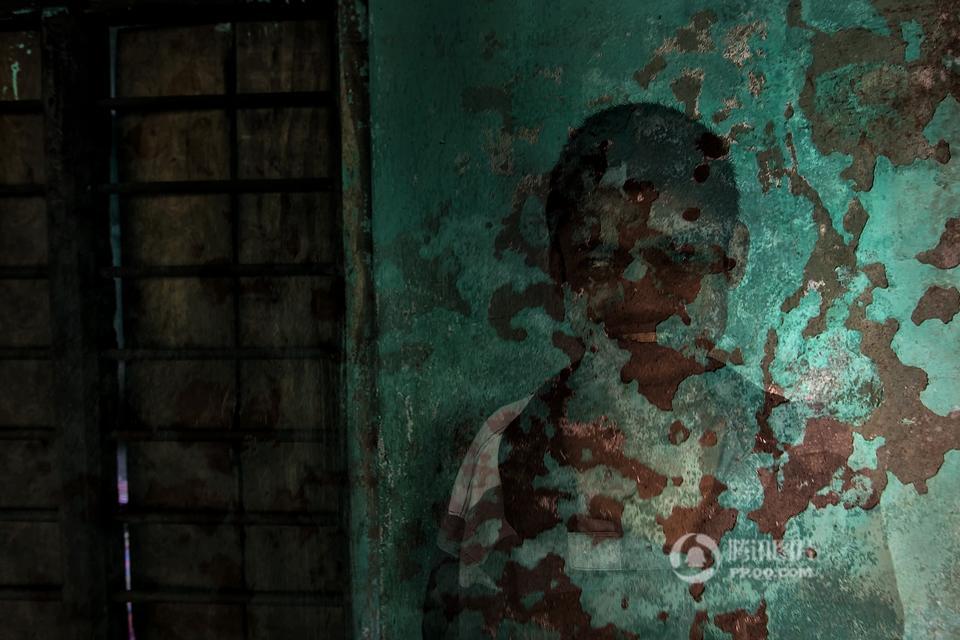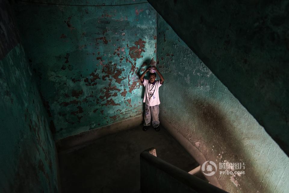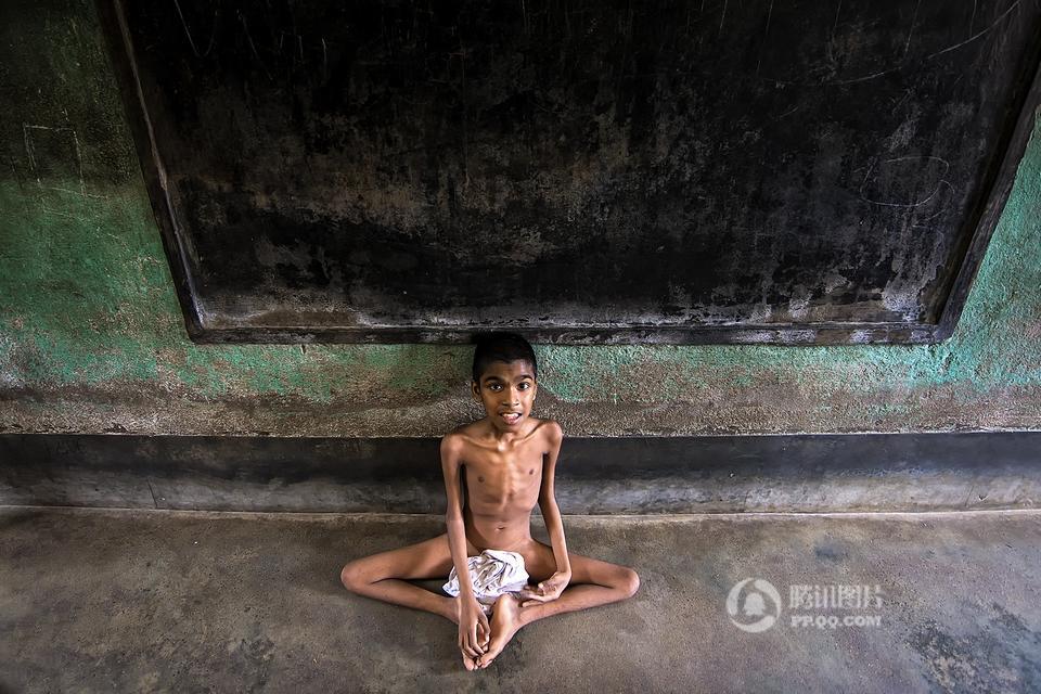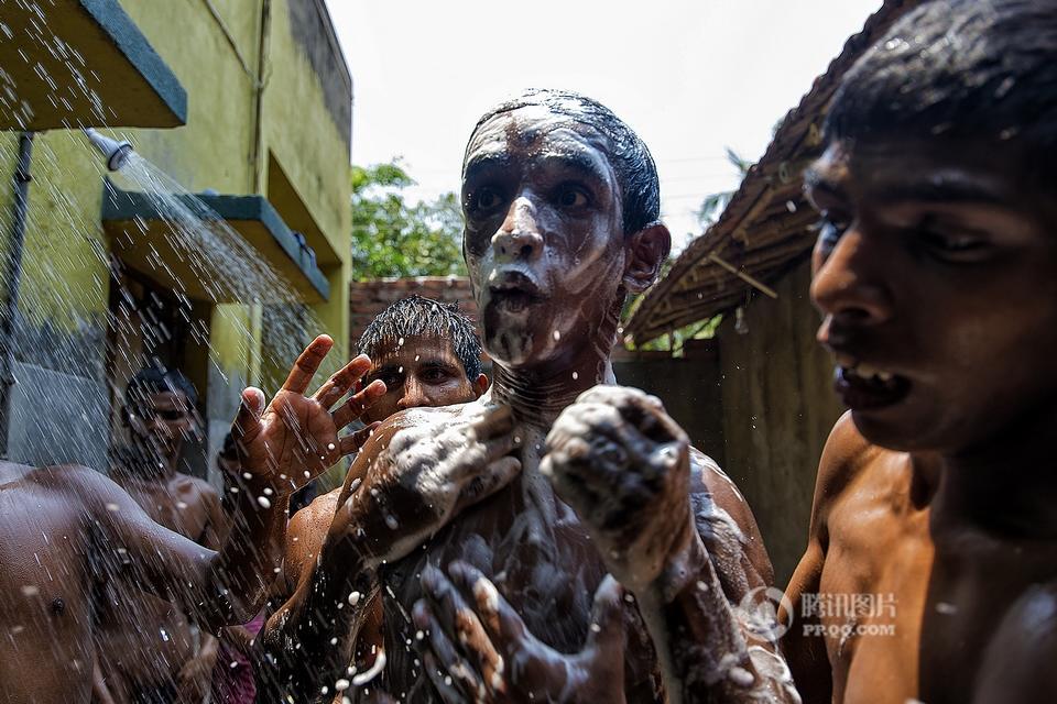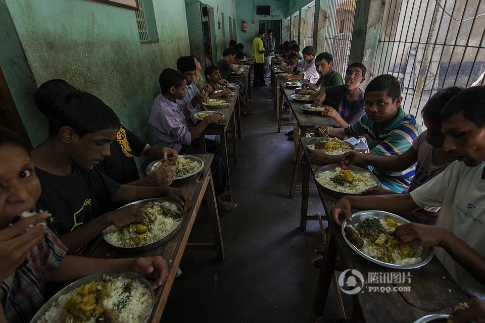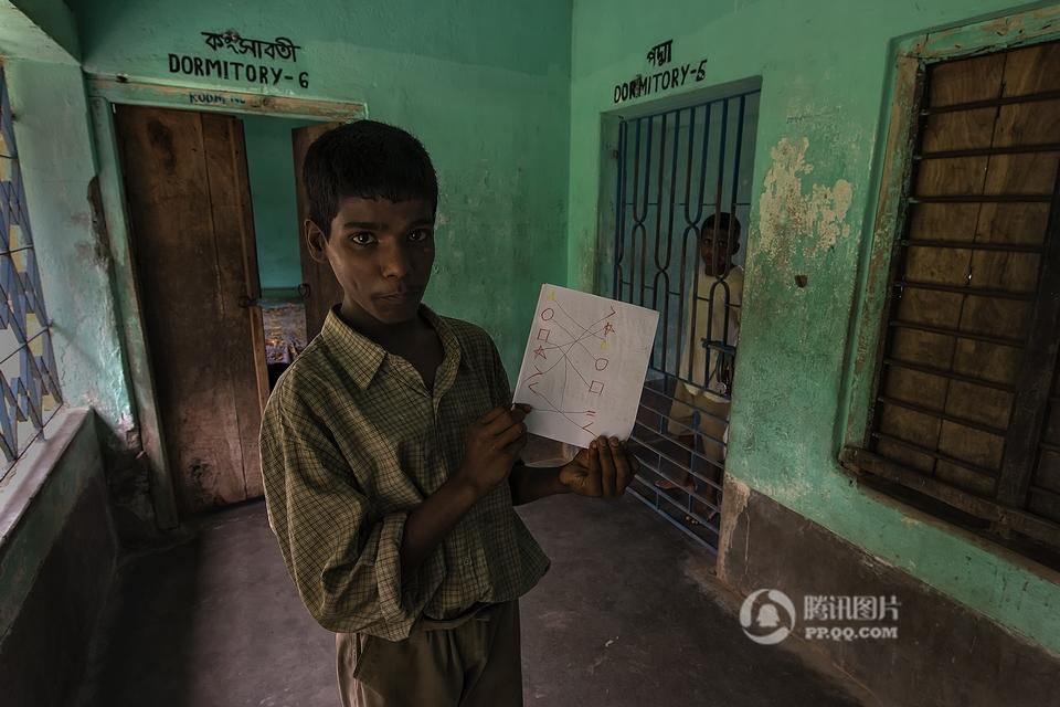 在印度西孟加拉邦哈儿迪亚镇的甘地阿什拉姆,有一所精神病院,里面生活着一群因为精神疾病而被遗弃的孩子。摄影师Joydeep Mukherjee去拜访了这个地方,并且在那里进行了三天的拍摄。通过这些照片我们很惊讶的发现,这群被灰色所笼罩的孩子们,依旧在用自己多彩的生活向他们的命运抗争着。图为精神病院内,一个孩子站在至尊拉玛克里斯纳——一个受人尊敬的印度教圣徒和传道人的照片下做祷告。本组图片拍摄于2015年5月。摄影师:Joydeep Mukherjee(个人网站 http://www.joydeepmukherjee.com/)