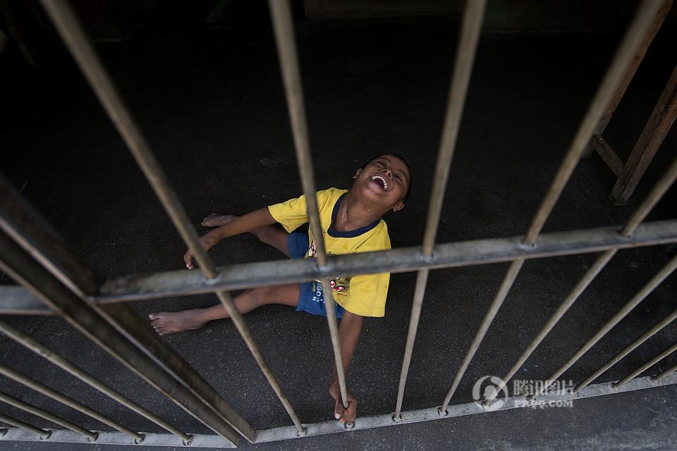 因为他有一些暴力倾向,所以需要特殊的照顾,从他的笑容可以看出来,他一定不是总被关在这个笼子里面。