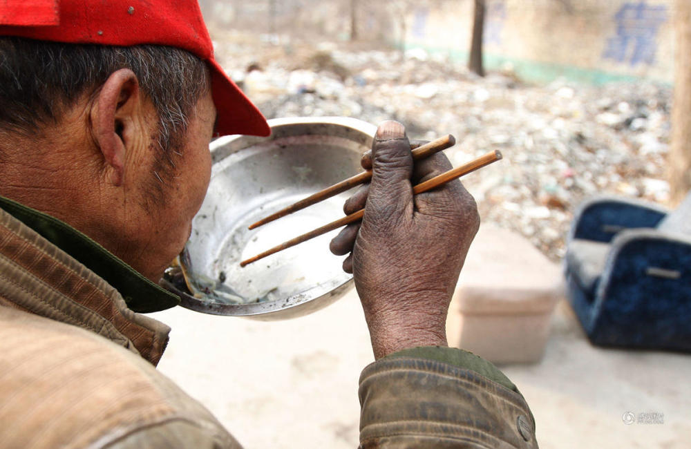 1月16日,郑州市西三环附近西流湖东岸,一片废墟的角落,一间塌了一半的屋子外,一名双手炭黑流浪汉将捧着的一盆面条吃了个净光。