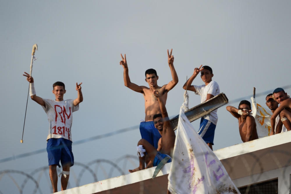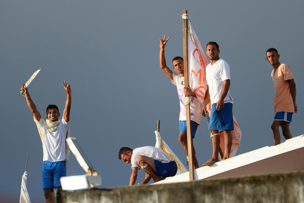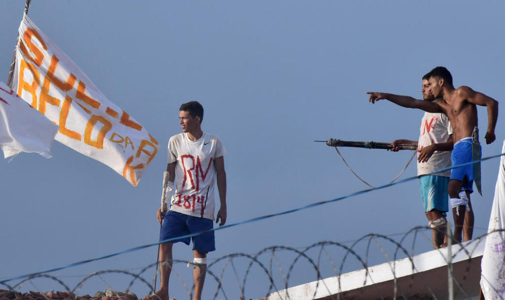 当地时间2017年1月18日,巴西北里奥格兰德纳塔尔,Alcacuz监狱发生暴动,囚犯爬上房顶。