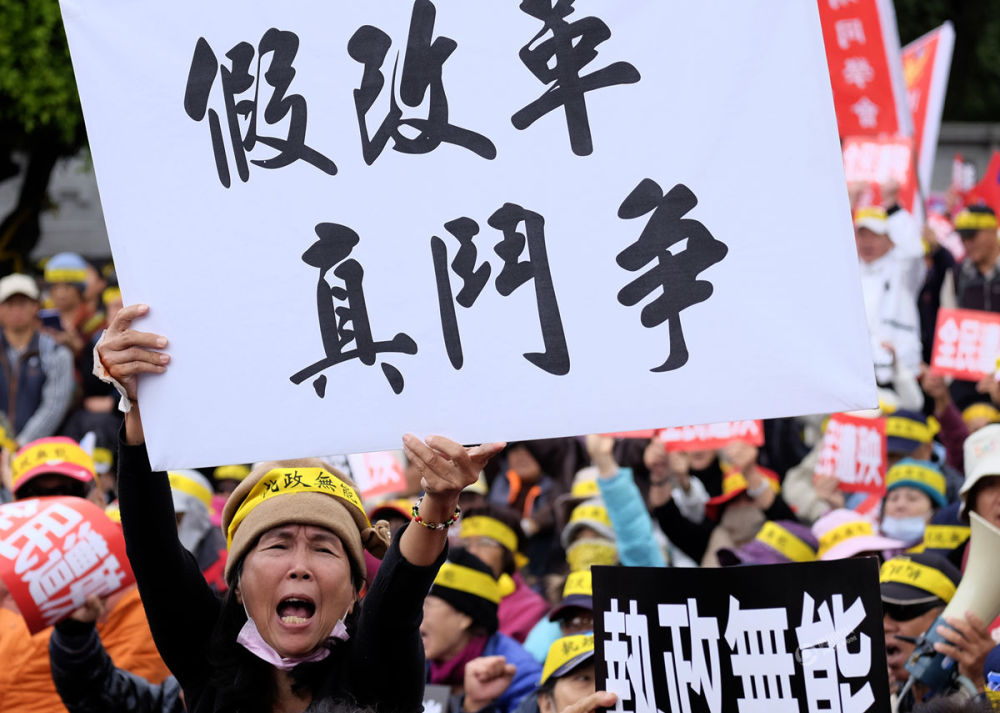 这次抗议由“监督年金改革行动联盟”、台湾退休教师联盟等团体发起。他们高喊“执政无能”“毁约背信”“假改革,真斗争”“反污名,要尊严”等口号,希望将不满和愤怒传进不远处的台当局领导人办公场所。图为抗议现场。