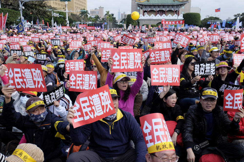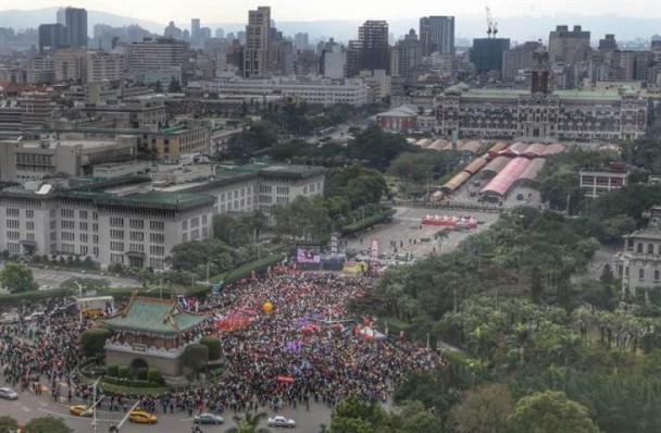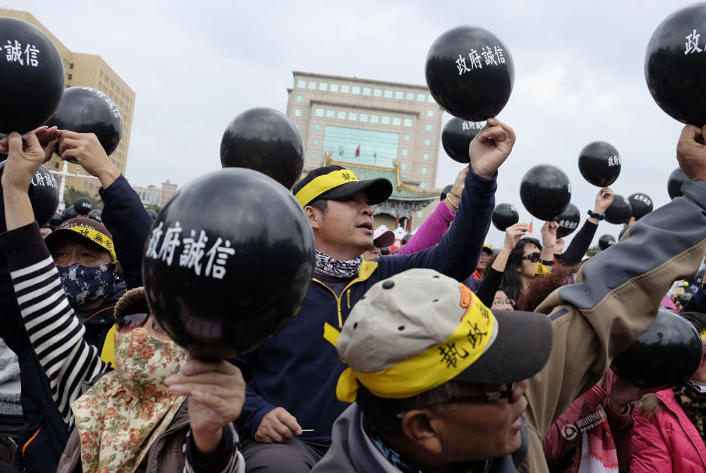 新华社台北1月22日电 22日的台北天气阴冷,但仍有以公务员、教师为主体的万余民众从岛内各地集聚台北抗议,反对台湾当局的粗暴改革和对公教群体的污名化。图为抗议民众集体撒纸钱。