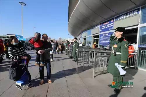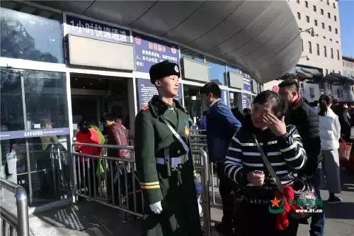 武警官兵为过往旅客保驾护航。这是在车站广场站岗执勤的官兵。奔走在回家的路上,当您从他们的身边走过,请向他们行个注目礼,向他们问句好。是他们,温暖了这个寒冬!