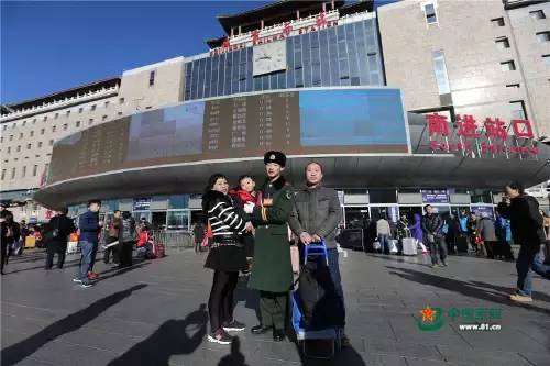 这感人的一幕,被查勤干部发现后,安排他们在儿子下哨间隙进行了难忘的相聚。记者也为他们拍了一张在北京西站春运现场的全家福。