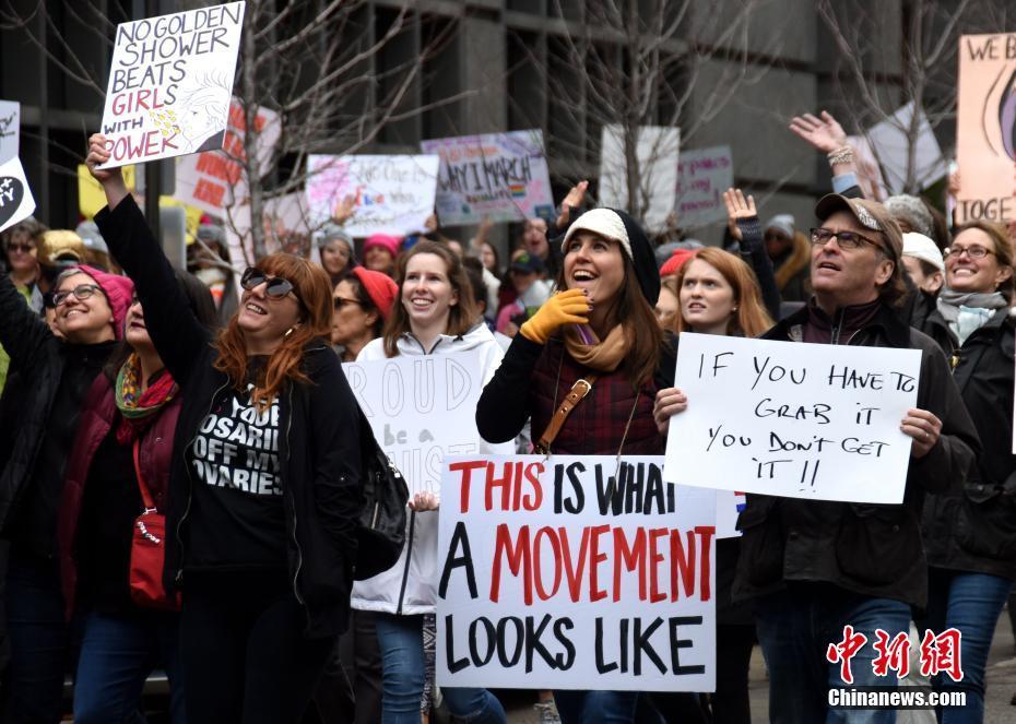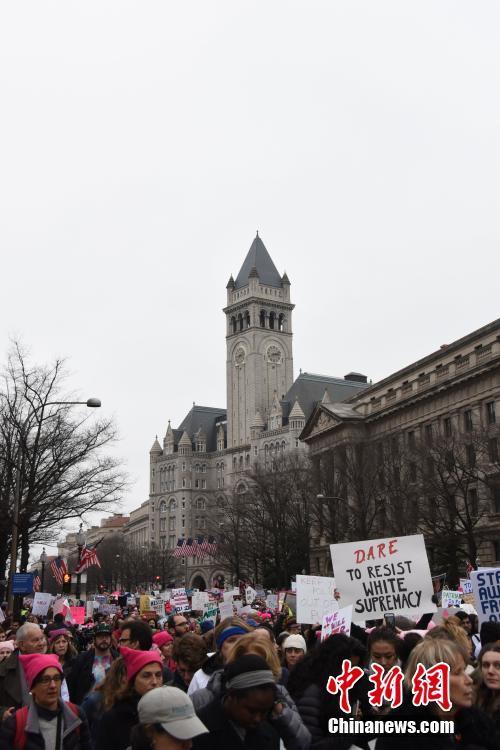 当地时间1月21日,特朗普就职次日华盛顿爆发大规模示威游行。华盛顿市内多条主要街道和地标性建筑附近涌入大量民众。有消息称,当天参与游行的人数超过50万。图为从特朗普国际酒店门前路过的游行民众。中新社记者刁海洋摄