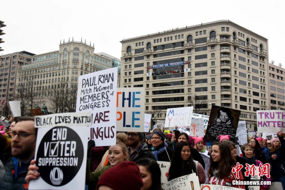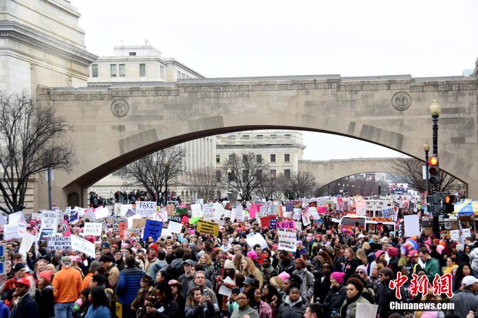 当地时间1月21日,特朗普就职次日华盛顿爆发大规模示威游行。华盛顿市内多条主要街道和地标性建筑附近涌入大量民众。有消息称,当天参与游行的人数超过50万。中新社记者刁海洋摄