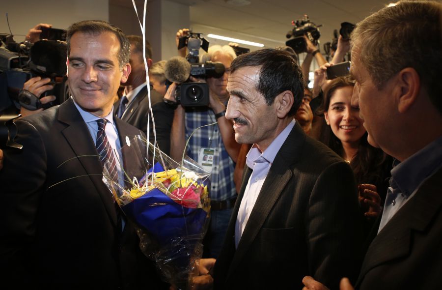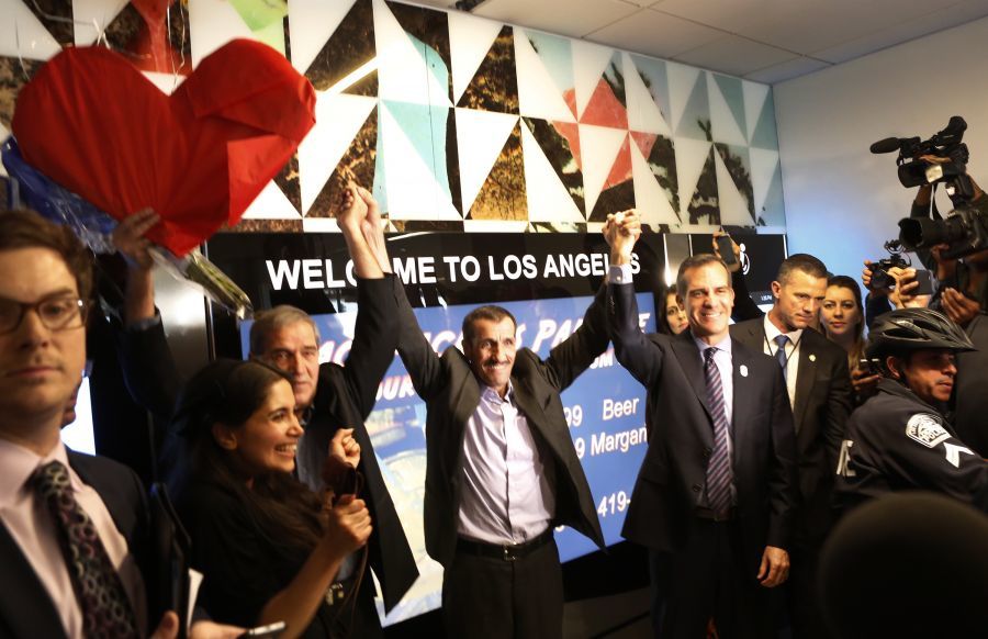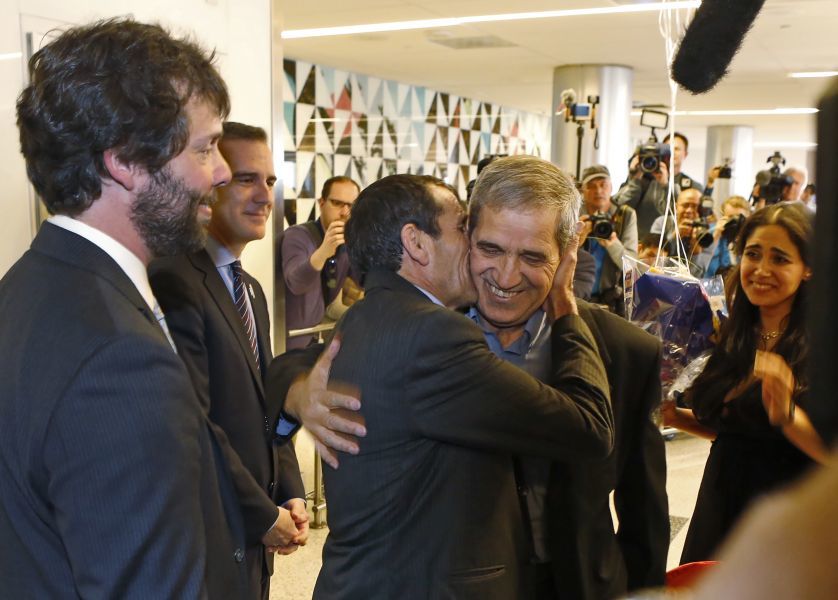 2月2日,伊朗公民Ali Vayeghanna重返洛杉矶国际机场,他此前因川普禁令而在机场遭遣返。他根据联邦法官的判决重回美国,受到洛杉矶市长贾希提的欢迎。Hossein Vayghan(中)在记者的陪伴下前去迎接他的兄弟Ali,他的女儿Marjan紧跟在后面。