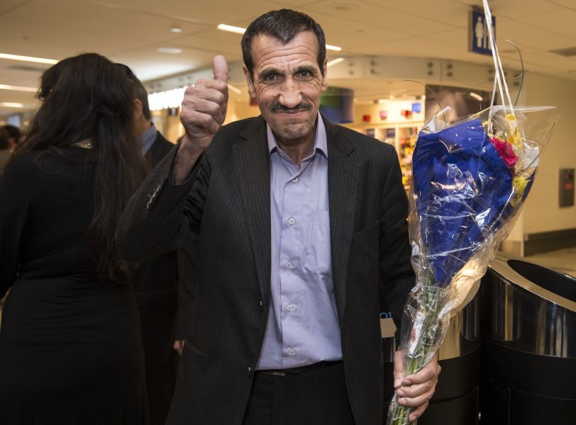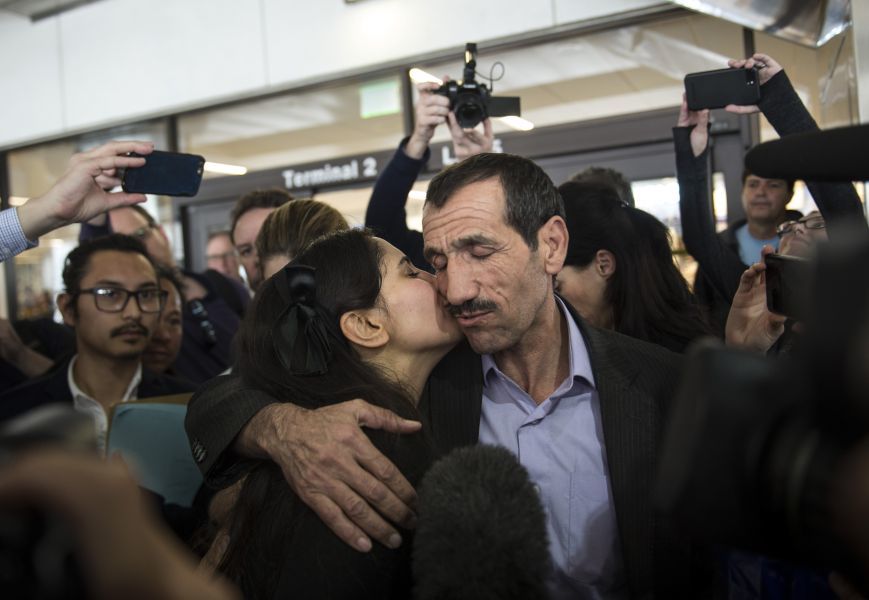 伊朗公民Ali Vayeghan持有有效美国签证,根据联邦法官的判决重回美国。他的兄弟和侄女在洛杉矶国际机场欢迎他。