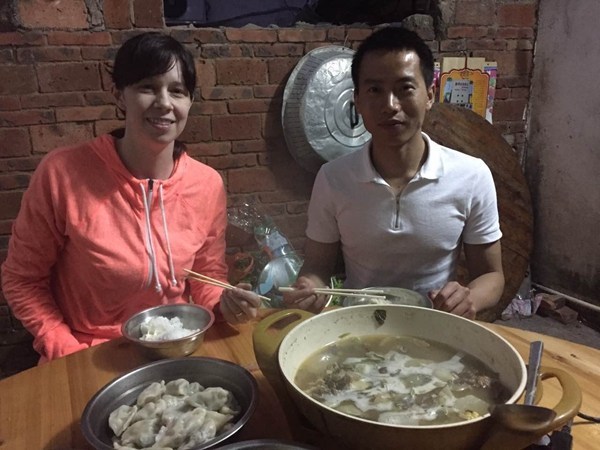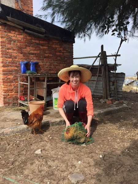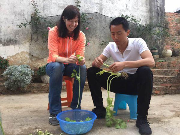 我的婆婆在室外厨房大声喊道:“家梅(音译)!”“家梅”是雷州话,吃饭的意思。湛江地区都讲雷州话,而这句是我唯一熟悉的雷州话。庆幸的是,我丈夫的亲戚大都可以说普通话,因而我跟他们交流也不是什么难题。只有他的小侄子们听不懂我讲话,他们要等到上幼儿园才学习普通话。我丈夫的英语水平很好,比我的中文水平要高,所以每当我无法用中文表达自己的意思时,他就会成为我的私人翻译。图为杰茜卡和“病号”母鸡合影。