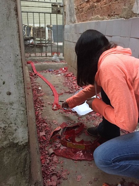 这是我第四次跟他回老家,不过作为他的妻子,这还是第一次。去年在返京的前一天,我们领证结婚了。时间紧促,我们俩只是喝了一杯白酒庆祝一下,周围人都恭喜我们。通常我们从北京回湛江老家都要坐慢车,37个小时的卧铺。今年由于工作原因,我们两个人分开回家。他比我早回去一周,依然乘坐火车;而我则第一次乘飞机回湛江。对我来说,4小时远比37小时好受得多。图为杰茜卡在放鞭炮。