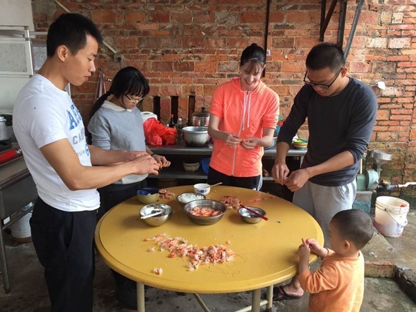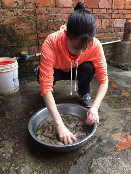 飞机在湛江那狭窄的跑道缓缓着陆,而我的春节假期就这样开始了。下飞机后,扑面而来的是温暖而略带微风的新鲜空气,让我真想在这待上几个月。我真的受够了北京那寒冷又干燥的气候。4个小时竟然发生这么大的变化。我的丈夫在机场迎接我,之后我们一起到公交车站等车,期间有几辆黑车司机过来问我们要不要乘车。当我丈夫告诉他们我是他的妻子后,他们的回答通常是一句拖着长音的雷州话“哇”。公交车来了,车身也就是北京公交车的一半大小,我们上车回家了。图为杰茜卡在洗虾。