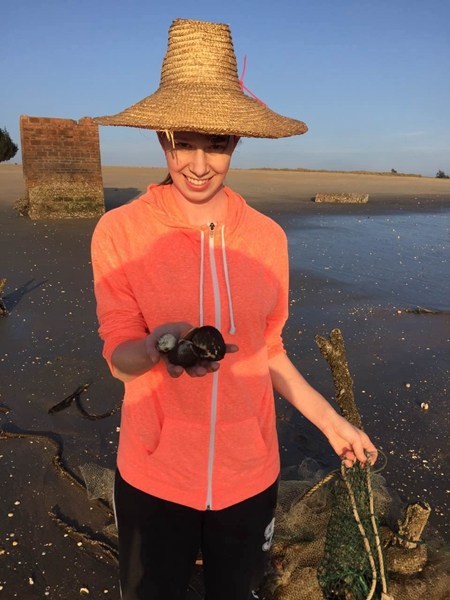 接下来的几天,我们都非常繁忙。每次我们回到老家,都要去他家租用的岛上帮忙。这个小岛叫南屏岛,方圆10公里,无人居住。只有养殖鱼虾的渔民们会前往该岛。除了鱼虾,岛上还有很多其他动物,如野山羊、牛、鸡和猫。此外岛上还有几处小棚屋,方便渔民们在岛上过夜、休息或做饭使用。图为杰茜卡手拿牡蛎。