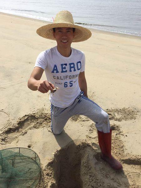 我和丈夫常常跟随他的弟弟和妹妹到那里去烤鸡吃。我们可以随处走走,享受新鲜的空气和美丽的风景。有一点很令我感到惊奇,沿着沙滩散步,总能发现好多蝎子。我们沿着沙滩散步时,丈夫会随身携带铲子和网,这样我们就可以挖沙蟹、牡蛎和蛤蚌了。晚上我们将收获的海鲜带回家,那就是我们的晚餐了。在南屏岛的沙滩上观赏日落,算得上我和丈夫的一个小习惯。图为杰茜卡丈夫手抓螃蟹。