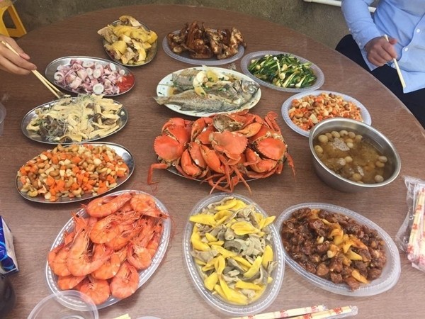 这里是渔村,因此我们吃的每顿饭里都有螃蟹、牡蛎/蛤、鱼或者虾等。我在美国中西部一个小镇长大,童年并没怎么吃过海鲜。如今我依然不太能适应吃海鲜,尽管它们都是从岛上面鲜活抓回来的。许多人可能认为我疯了,因为我通常吃的并不多。说实话,有些海鲜我喜欢吃,但有些确实不喜欢。如果吃太多海鲜,我还会生病。我丈夫却不一样,他吃起海鲜来,就像一个无底洞,能吃个不停。图为杰茜卡与丈夫(左一)及家人剥虾。