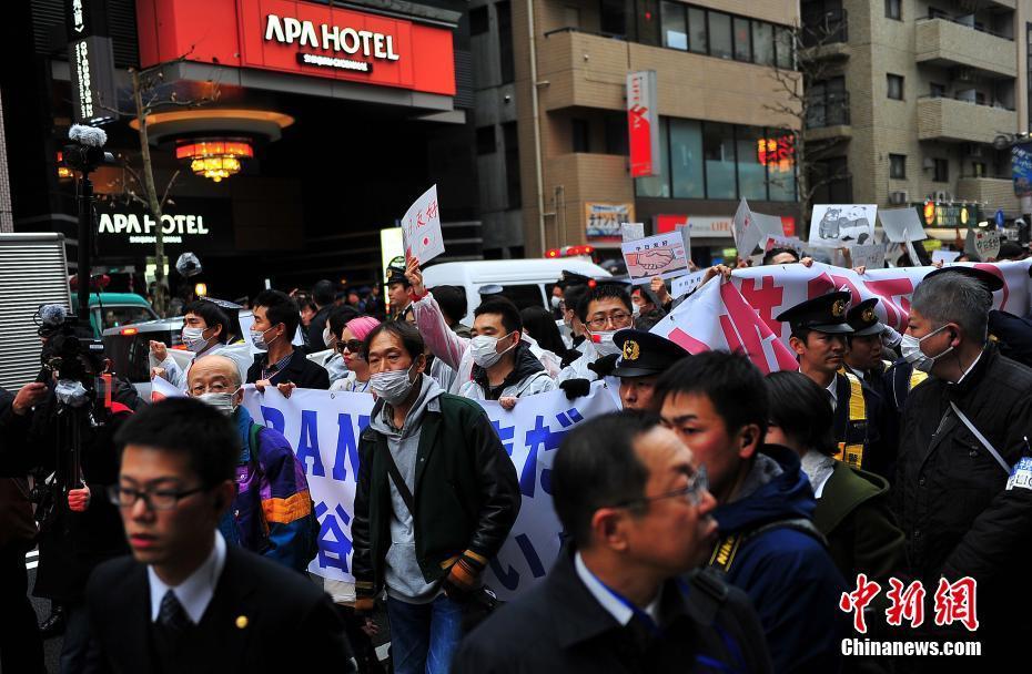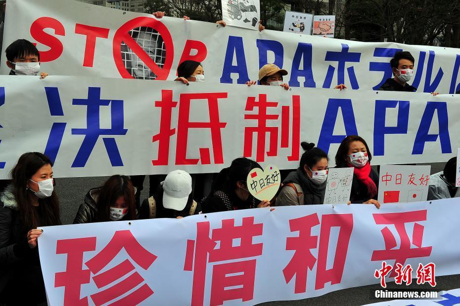 2月5日下午,近百名在日华侨华人和中国留学生在东京举行了抗议APA酒店的和平游行活动,抗议APA酒店长期在所有客房中放置由该集团老板元谷外志雄撰写的否认、歪曲历史的右翼书籍。中新社记者王健摄