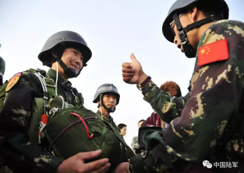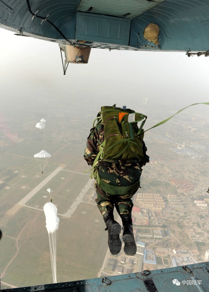 特战女兵进行高空伞降。
