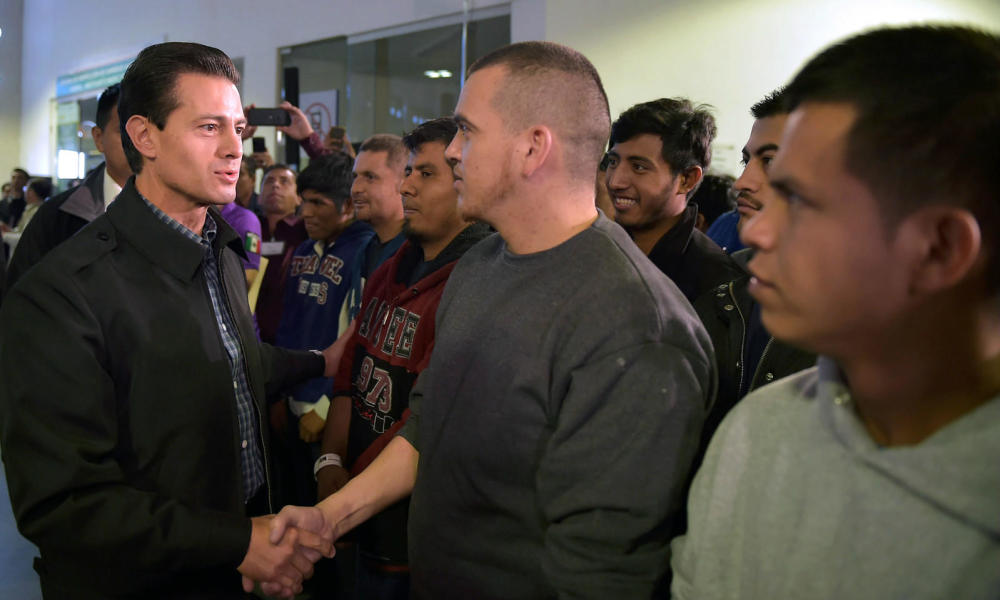 当地时间2017年2月7日,墨西哥墨西哥城,墨西哥总统涅托亲自前往墨西哥城国际机场欢迎135名被遣回国的旅美墨西哥移民,这是美国新总统
