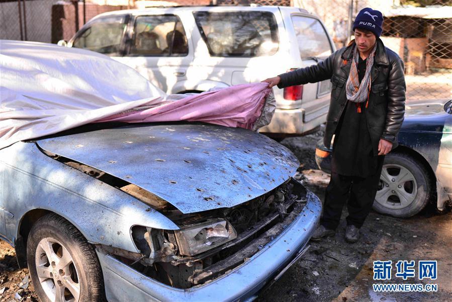 2月9日,在阿富汗首都喀布尔,一名男子查看在爆炸中损毁的汽车。