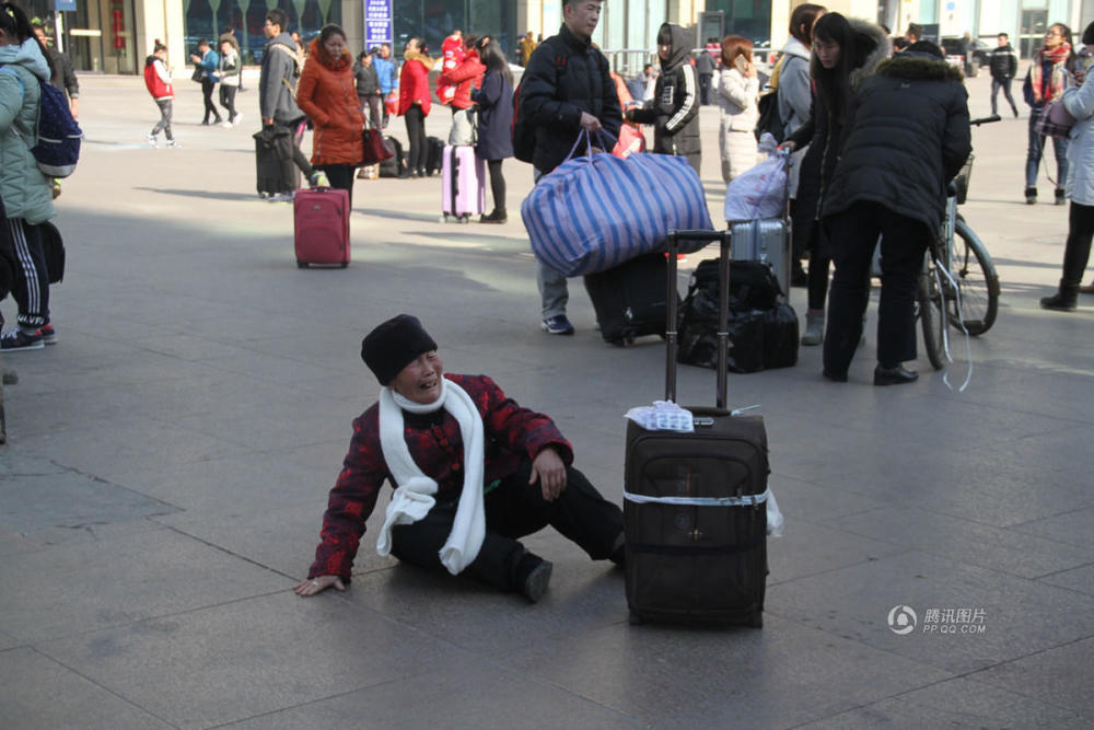 2017年2月12日,在山东济南火车站出站口,一位70多岁的老人乘火车独自出站,没有见到亲人在出站口大哭。陈宁/视觉中国 等不到亲人的老人在火车站出站口处大哭。