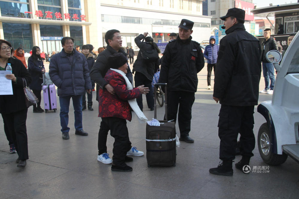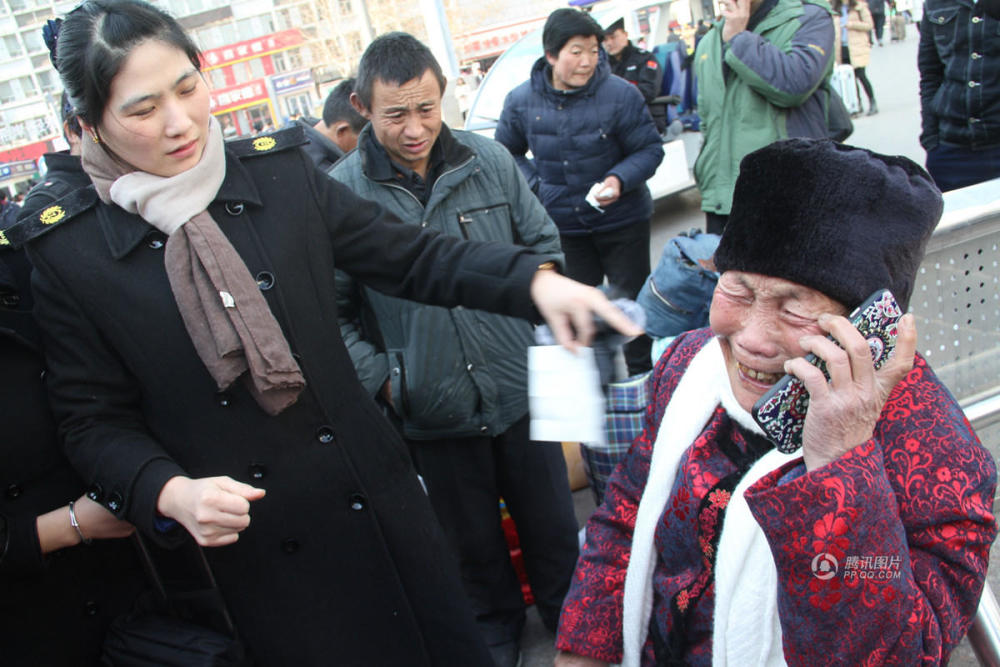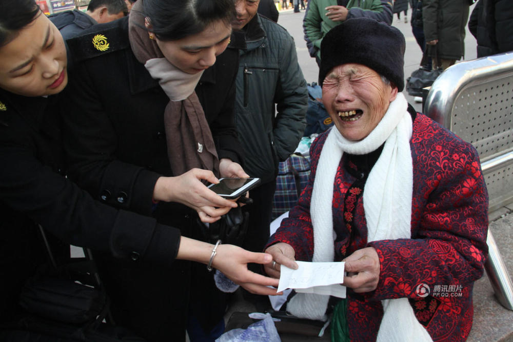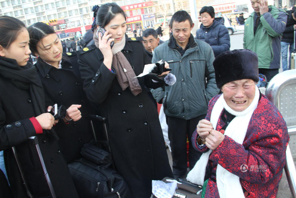 众多好心人见状,上前为她寻找接站亲人,询问电话与亲人联系。