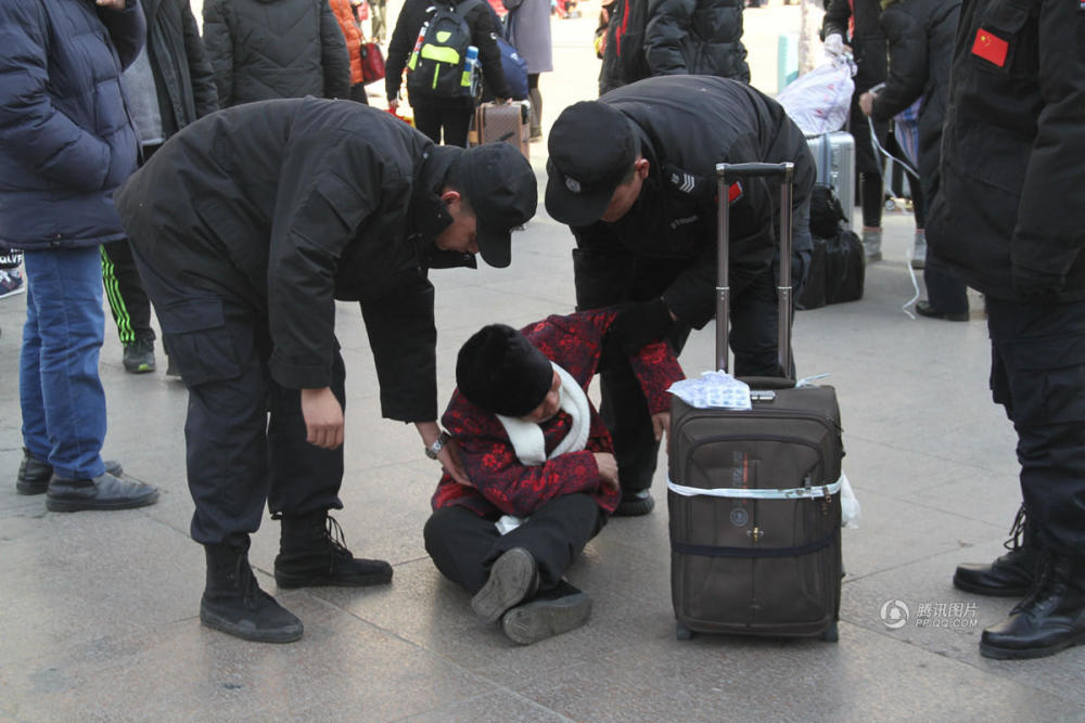 车站的值班工作人员扶起老人。