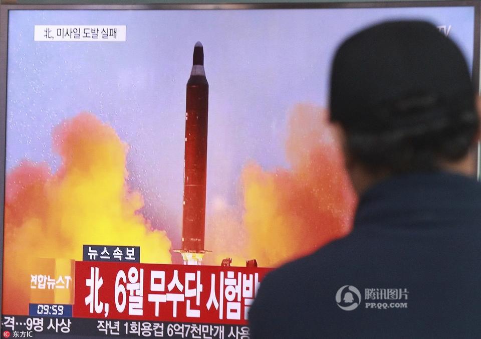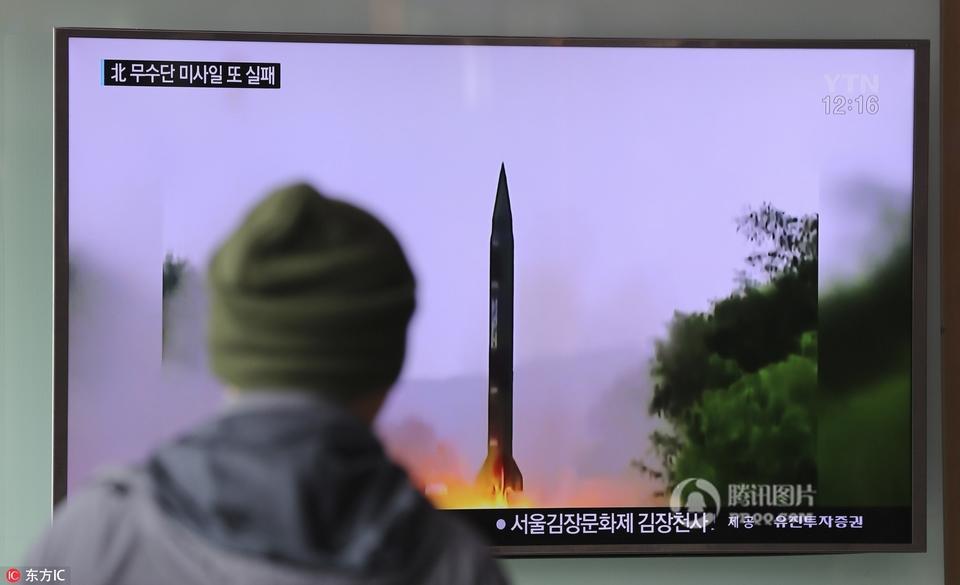 报道称,这是自特朗普成为美国总统后,朝鲜就弹道导弹进行的首次测试。报道还称,韩国召开国家安保会议商讨应对朝射弹方案。资料图为当地时间2016年10月16日,韩国首尔,韩国民众观看电视报道朝鲜发射导弹。韩国和美国称朝鲜15日疑在在平安北道龟城市发射一枚“舞水端”中程弹道导弹,但发射以失败告终。