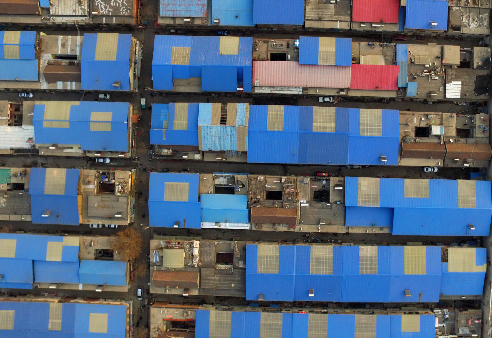 2017年2月13日,山东济南,航拍即将消失的城市中的“城中村”,密密麻麻的彩色蓝屋顶如同像素块一般,俯瞰场面十分壮观。(东方IC)