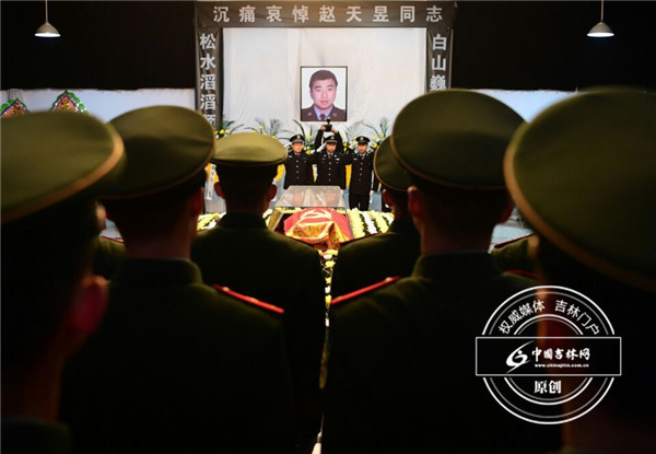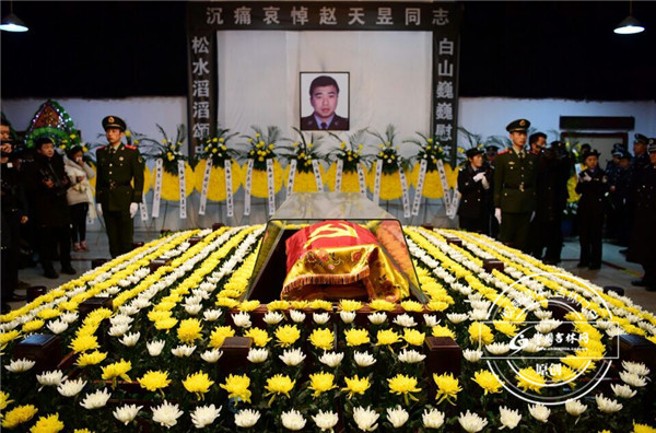 2月10日18时许,吉林辉南县石道河派出所副所长赵天昱在出警执行抓捕任务时,与持刀犯罪嫌疑人于某展开殊死搏斗,身中21刀,壮烈牺牲。2月14日6时,在辉南县殡仪馆内举行赵天昱的遗体告别仪式。