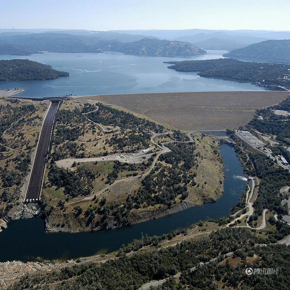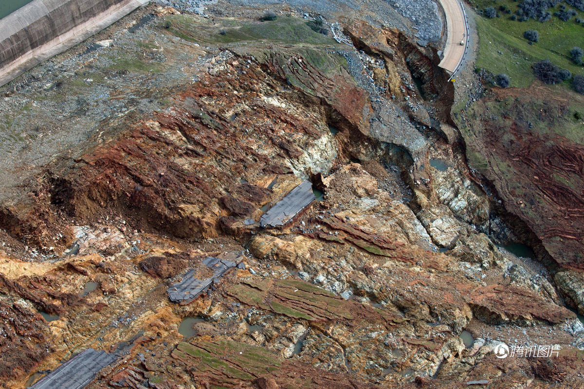 由于连年干旱,奥罗维尔湖大面积萎缩,但这个不寻常的潮湿冬季,湖水在不到一周的时间内几乎要溢出来。从上往下分别是大坝坝体,主泄洪道和备用紧急泄洪道,备用泄洪道基本就是一条泥土陡坡。