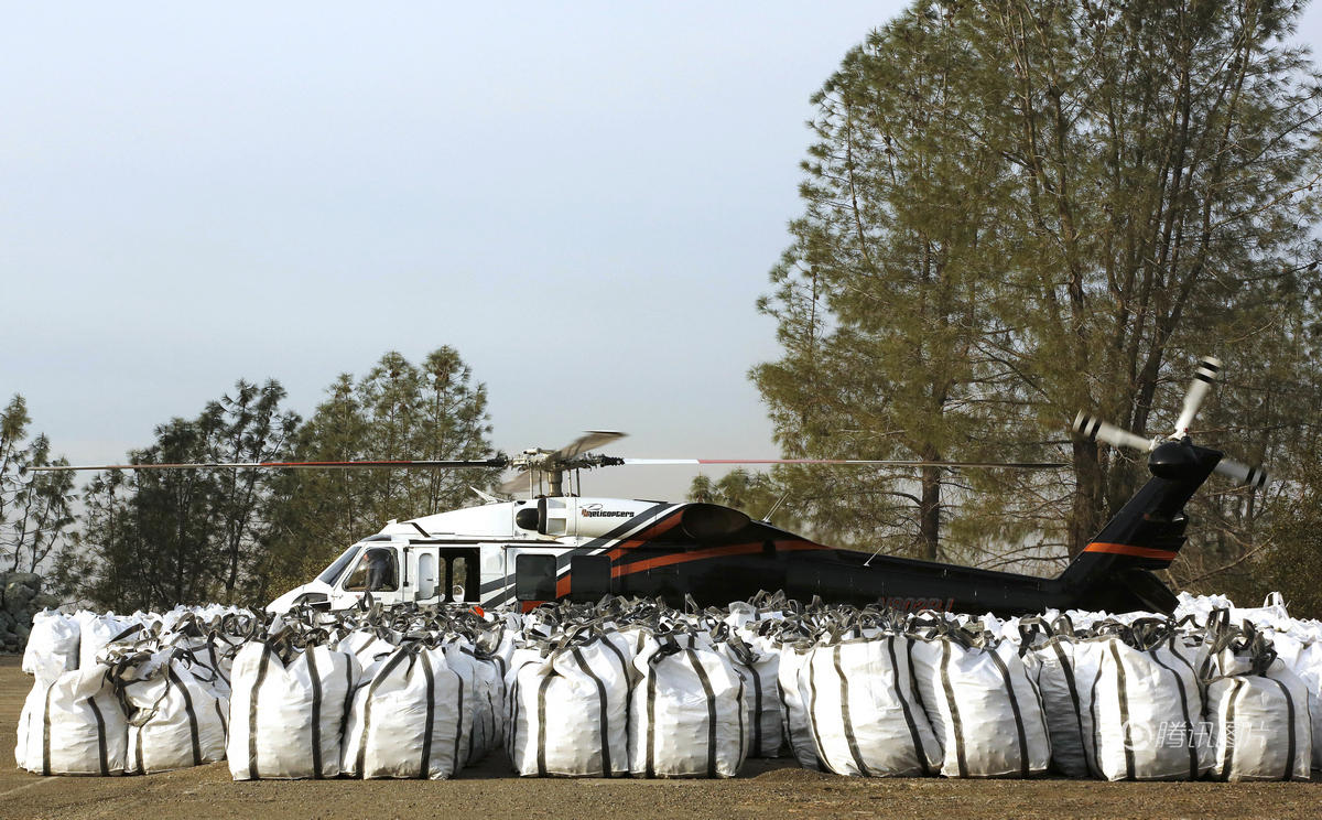 直升机13日清晨将装满大石块的袋子吊运到泄洪道附近堵大洞。