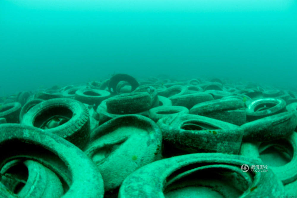 轮胎绵延在海底,已经严重腐蚀,已然成为一个轮胎坟墓。