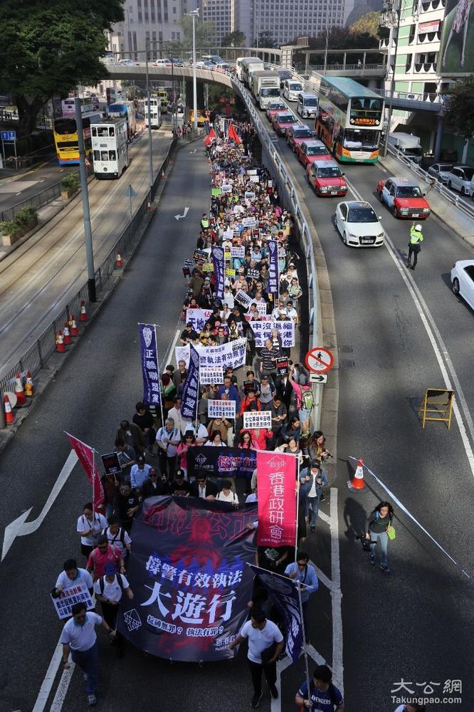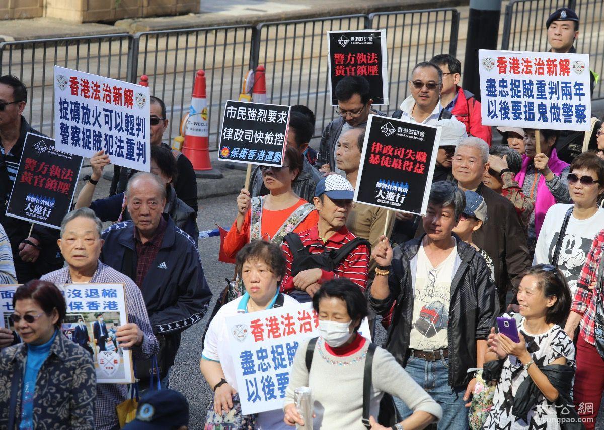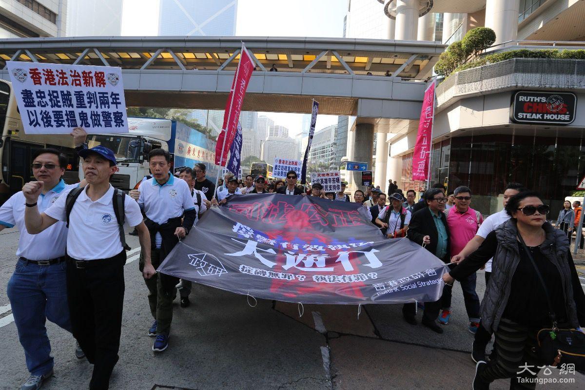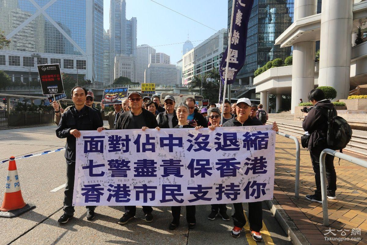 游行人士高举“占中搞手逍遥法外”、“七警尽责保香港”等标语,以行动诉说心声。港大校委会委员卢宠茂表示,他以普通市民身份参加游行,认为重判对维护法纪的执法者不公平,七个家庭的前路更令他忧心。