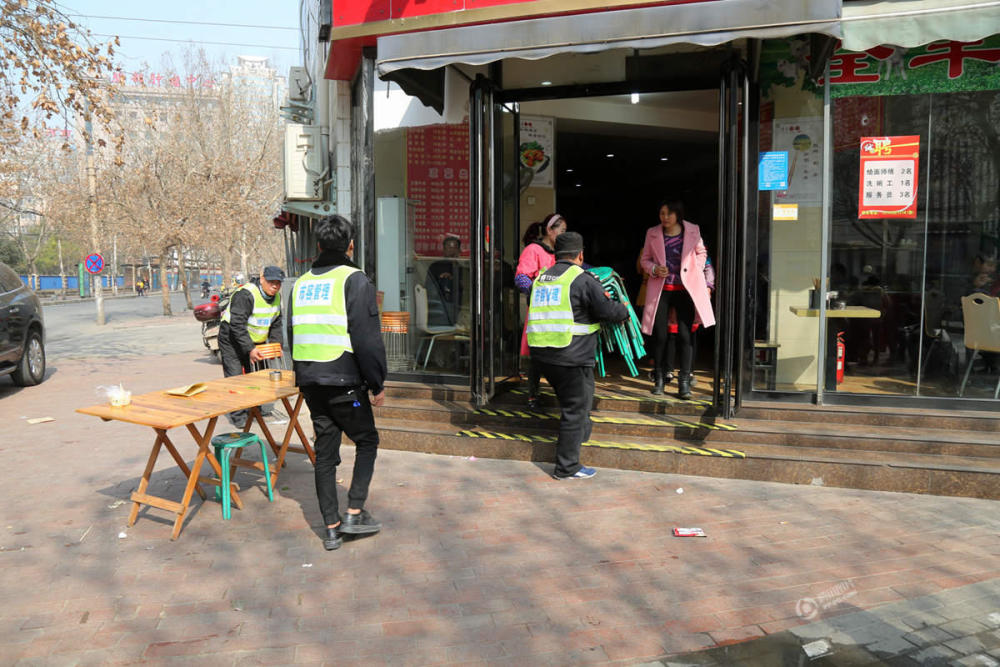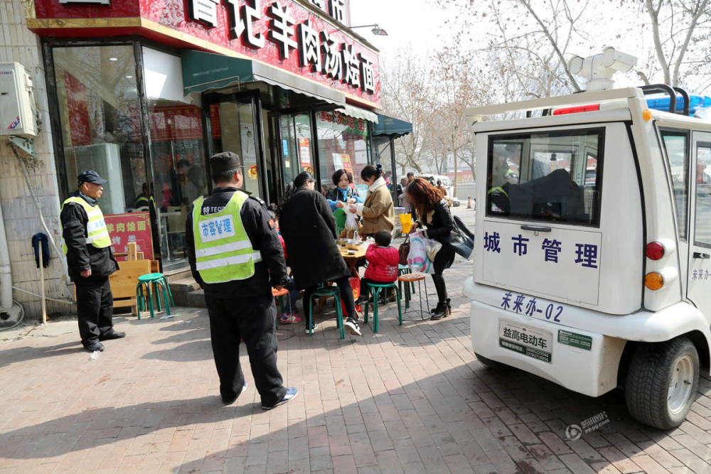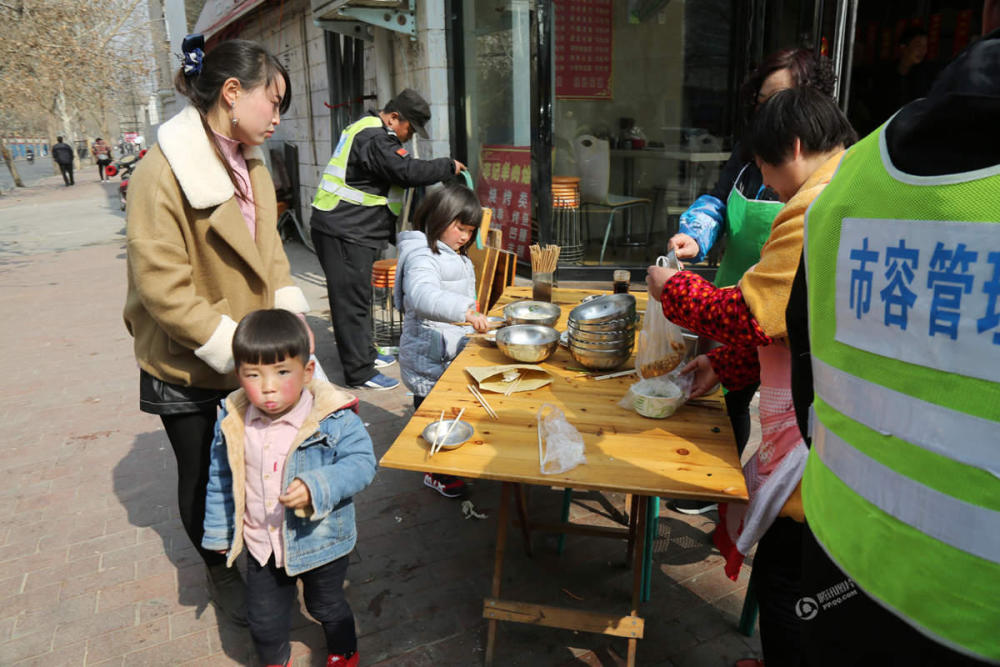 2017年2月19日,郑州纬五路一家饭店门前,有几个大人带着小孩在外面的桌子上吃饭。虽然属于占道经营,但城管并没有着急上前让收桌子,而是站在一旁,等吃完饭才催促店主收摊。子君/视觉中国