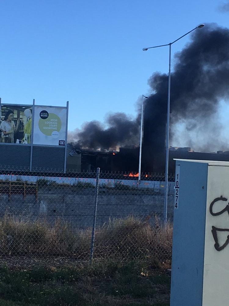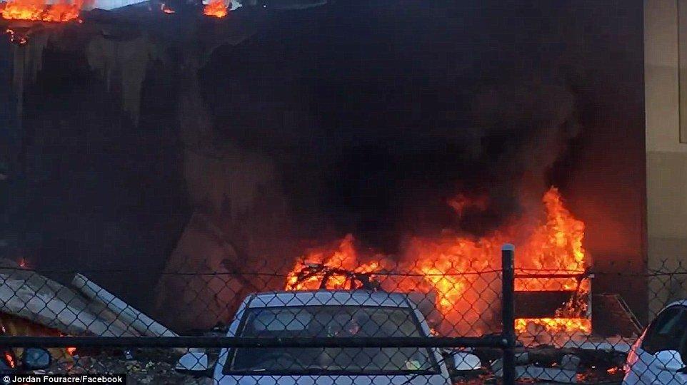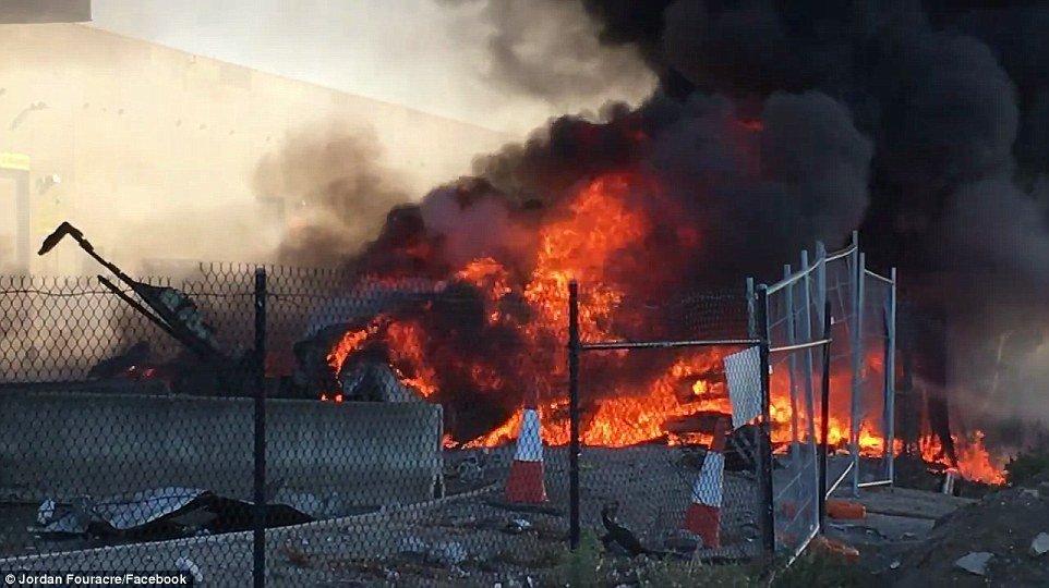 DFO购物中心的屋顶被撞了一个大洞,屋顶处火势严峻。
