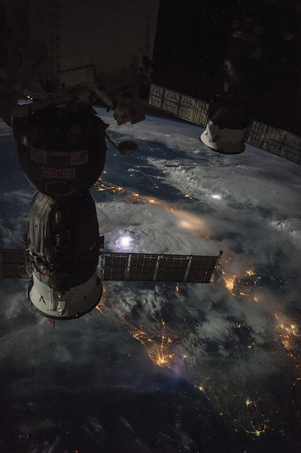在国际空间站的下方,城市的灯光氤氲在云层中,人类的日常生活已然改变了地球在太空中的面貌。