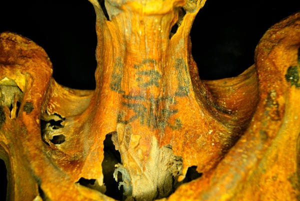 在去年四月份,一个人类学研究会议上,一副埃及木乃伊的照片被公之于众。这个木乃伊的脖颈部位纹饰了一个有些吓人的图腾——两只坐着的狒狒代表了对脖颈的守护。