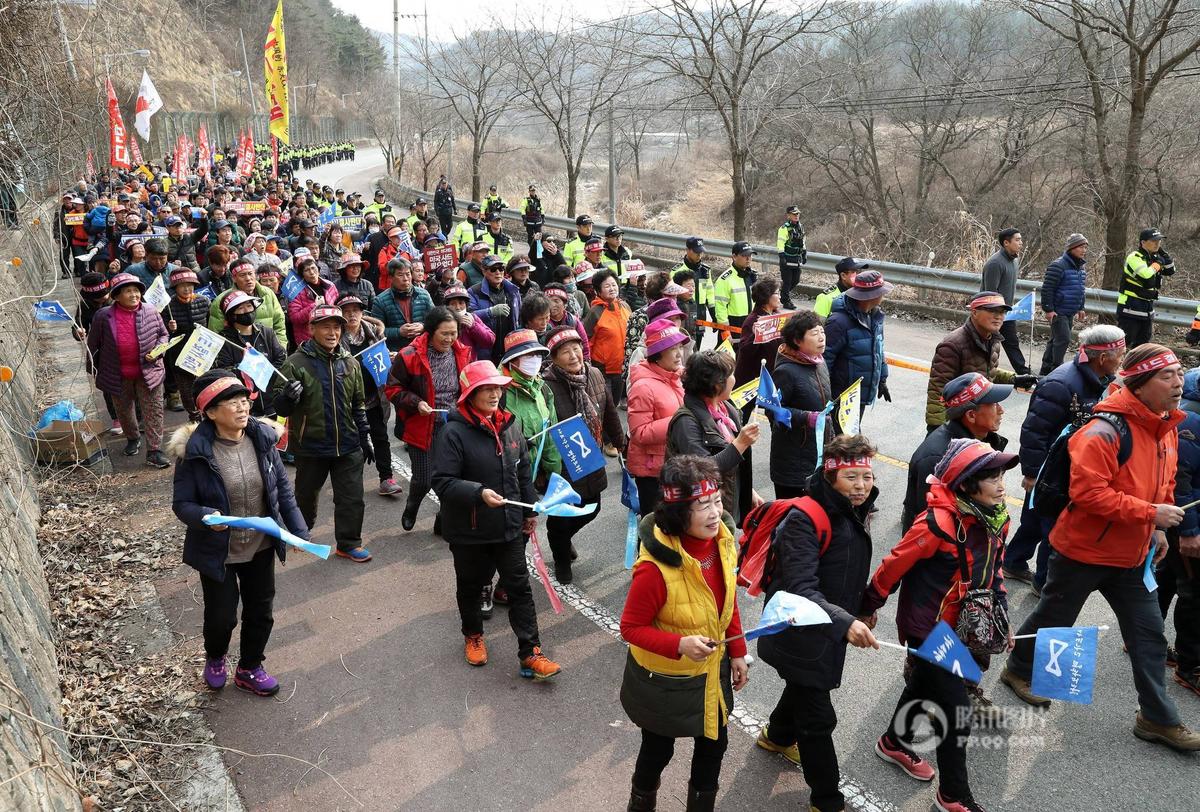 居民们2月28日下午3时开始向星州高尔夫球场进发。星州高尔夫球场距离会馆有2公里,居民们高喊着“赶走萨德,换我和平”、“誓死反对部署萨德”、“萨德滚回美国”等口号向着星州高尔夫球场行进了700米,之后便遇到警方的阻拦。