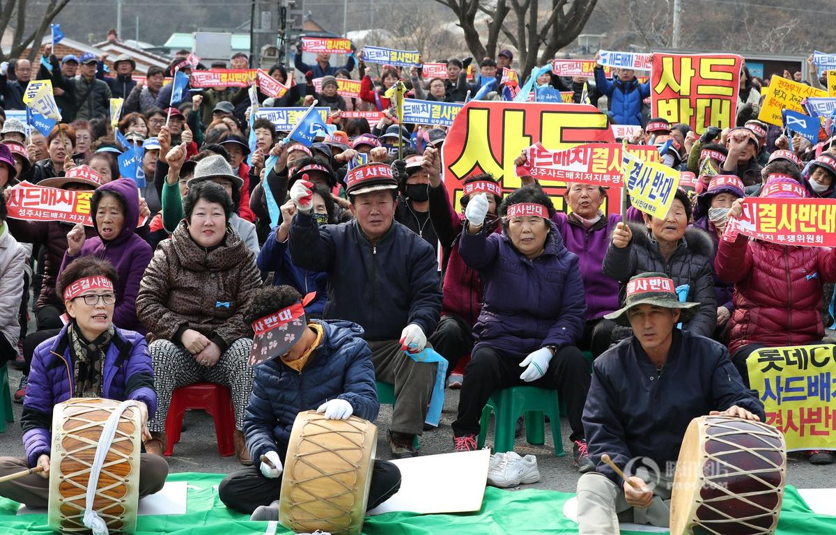 2月27日,韩国国防部表示,乐天集团召开董事会会议,决定把星州高尔夫球场地皮转让给国防部用于部署“萨德”反导系统。在乐天向“萨德”部署地点开绿灯后,星州高尔夫球场附近的气氛骤然紧张。当地时间2017年3月1日,韩国庆尚北道星州郡,当地民众集会游行,反对在当地部署“萨德”。