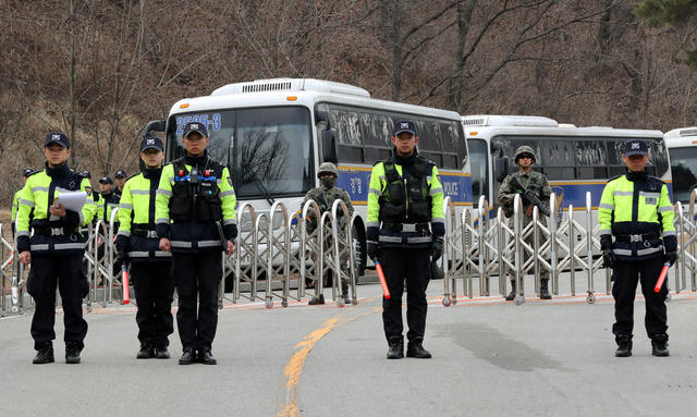 当地时间2017年3月1日,韩国星州,韩国警察和士兵在星州高尔夫球场站岗。