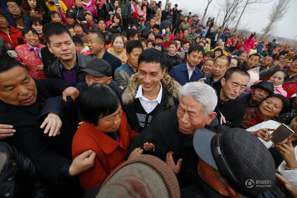 汽车到达薛宅南村村口,王琪老人和亲人们下车徒步进村,数百米的村道上锣鼓喧天,鞭炮齐鸣。早早在路边等候王琪的二哥、四弟和小妹等家人以及远近赶来的乡亲们把老人团团围住。处处洋溢着亲情。苟秉宸/视觉中国
