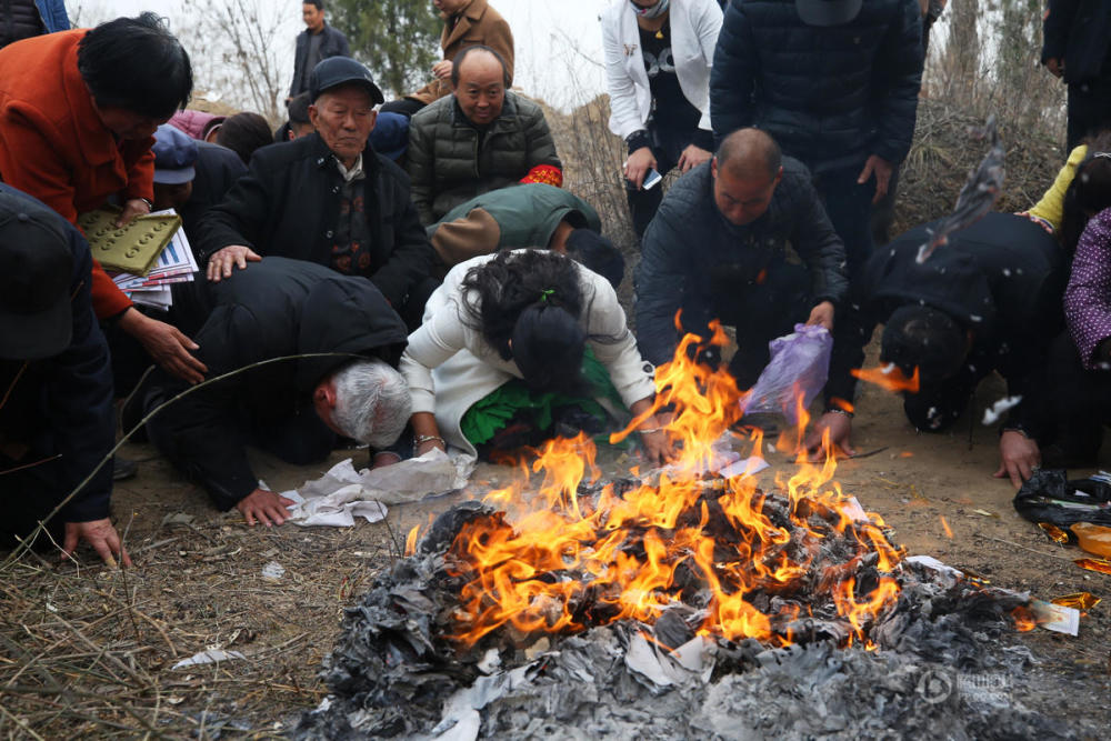 短暂休息后,王琪带着儿子和儿媳在家人的陪同下来到了村边的母亲坟前。王琪老人双膝跪地,几十年的思念、委屈和遗憾让老人的泪水夺眶而出。祭奠传统而简洁,却充满仪式感。苟秉宸/视觉中国