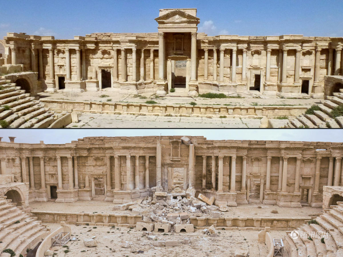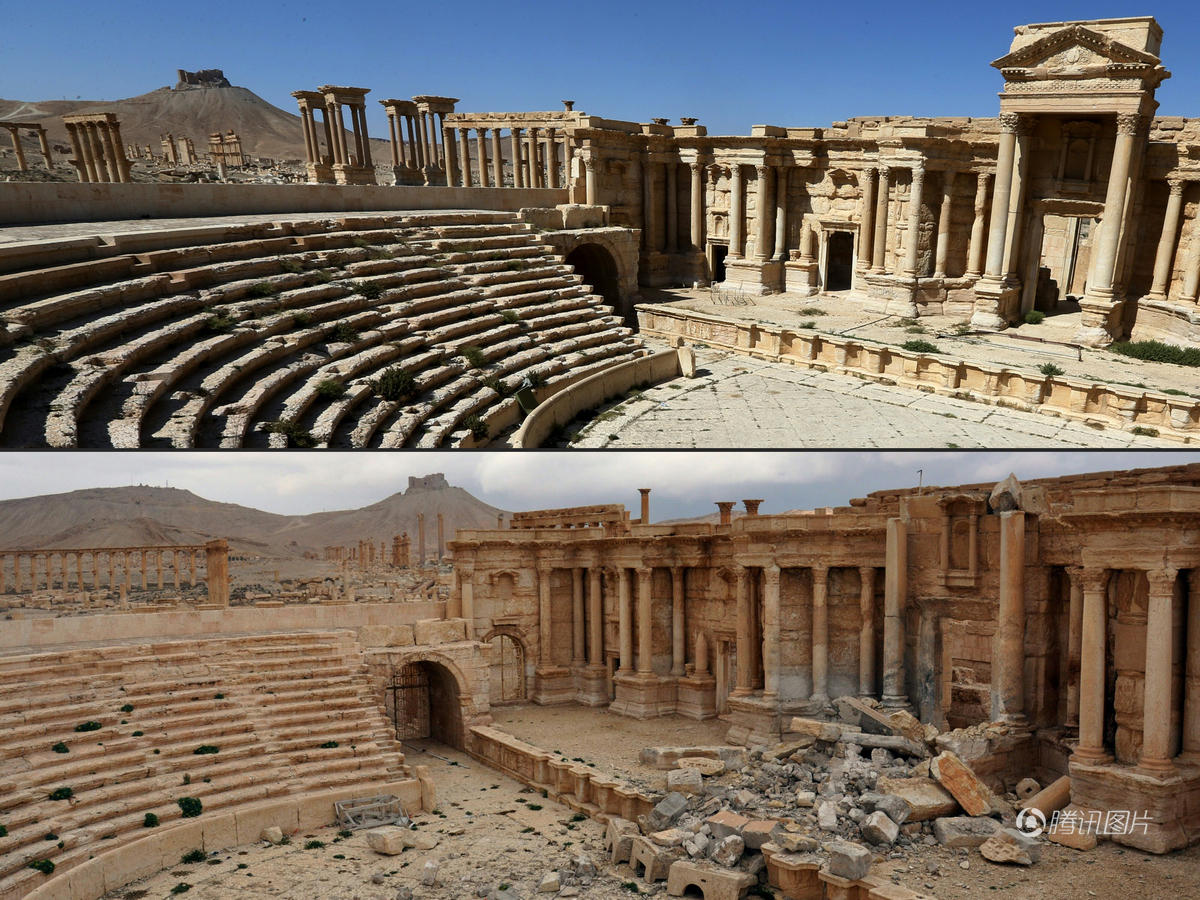 “伊斯兰国”2015年5月攻占巴尔米拉。去年3月,叙政府军收复这座古城。去年12月,在政府军集中兵力收复北部重镇阿勒颇之际,“伊斯兰国”再次夺取巴尔米拉,并炸毁最为著名的四塔门及古罗马剧场。图为古罗马剧场被毁前后对比照片。