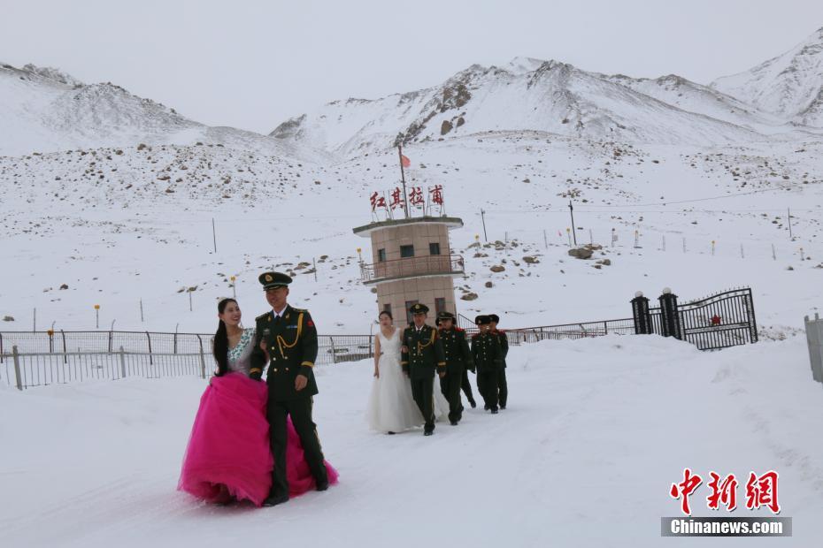 当日上午,红其拉甫边防检查站三名新婚夫妇乘车来到前哨班,穿上了专程从三百多公里外的喀什市租来的婚纱,在官兵们的掌声和祝福声中,三对新人走出前哨班,来到位于中巴边界的7号界碑前。图为三对新人在7号界碑前庄严宣誓表达对爱情的忠贞不渝。
