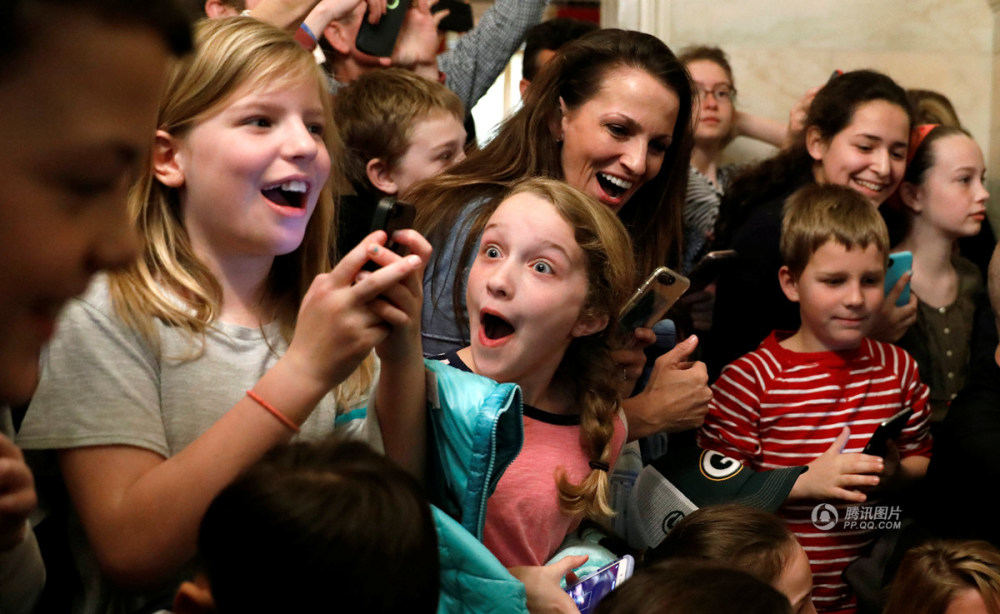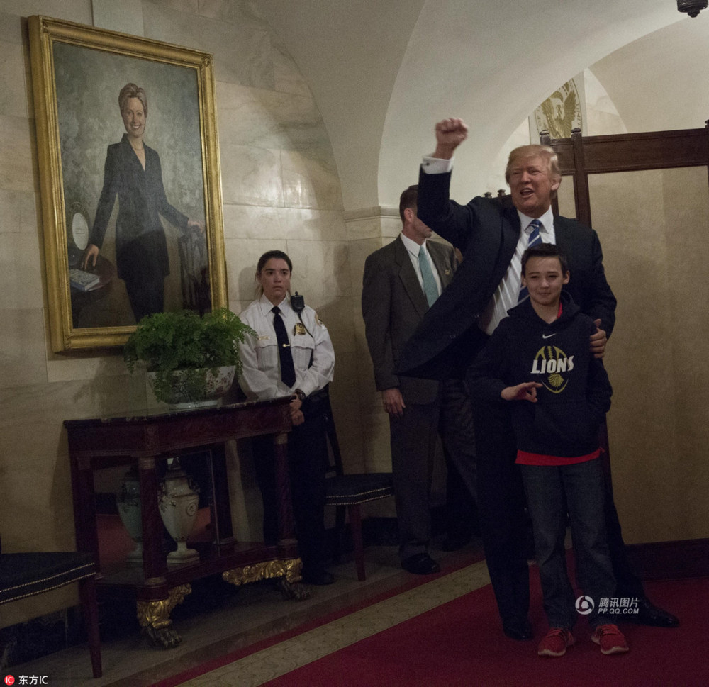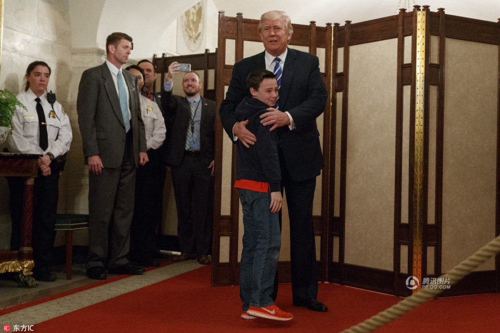 特朗普还非常亲民地和一个小男孩合了影。当时特朗普向人群示意让孩子们走上前来,不过只有这个勇敢的叫杰克的小男孩走了出来。