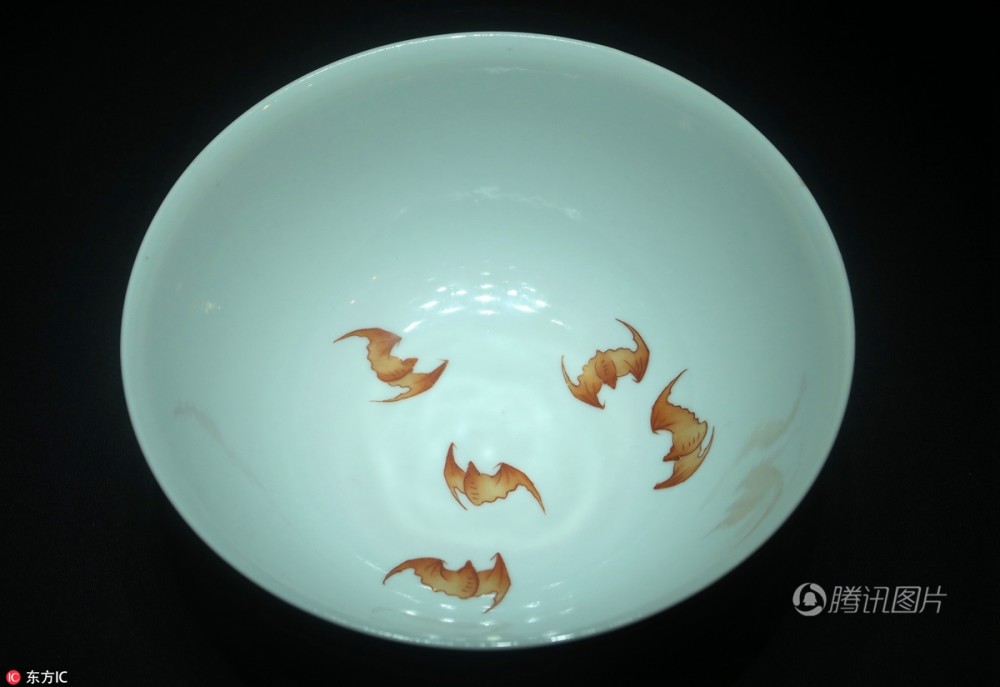 清乾隆黄地洋彩花卉纹五福碗内壁绘有五只蝙蝠。