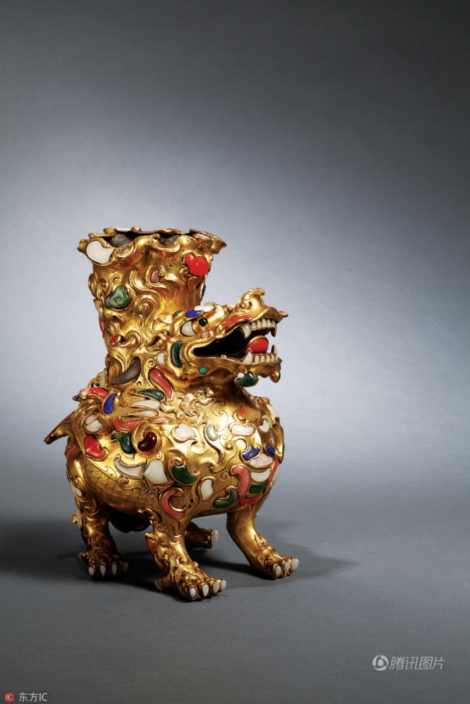 清乾隆铜鎏金嵌百宝瑞兽香炉。
